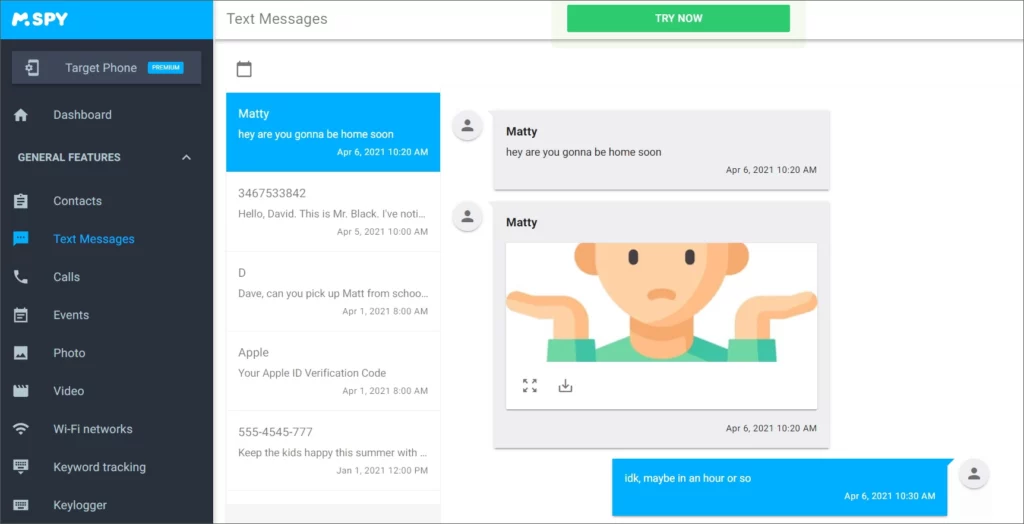 • Call and Text Monitoring: Tracking coming and outgoing calls, text messages, as well as Instagram, Facebook, Snapchat, and other social media messages from popular platforms.